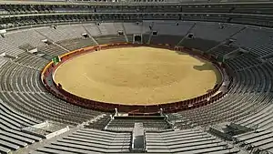 斗牛场在建造时,位于鲁扎法城门附近的城墙外。建筑师设计了这座17.50米高、共有48个面的建筑。这是建筑使用铸铁柱,以增加透明度的早期例证。这是西班牙最漂亮的斗牛场之一,最初斗牛场的内径为52米,后来缩小了。其外径为108米,可容纳16851名观众,后来减少到12884个座位。正如当时的媒体所称,这样的尺寸使它成为西班牙最大的斗牛场之一。它于1859年6月20日落成。[3]()。。