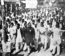 1954年,位於東巴基斯坦的抗議遊行。當時的總理穆罕默德·阿里·博格拉透過戒嚴令,利用位於東巴基斯坦的軍隊以控制法律和秩序。[47]:75