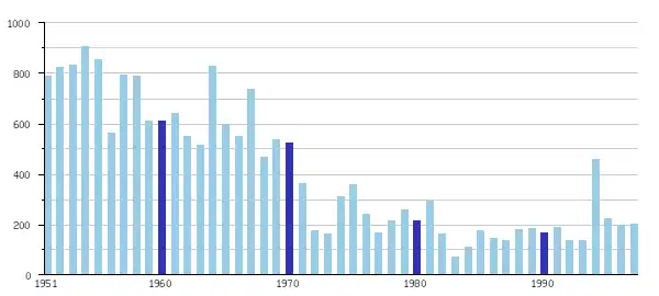- Data from several sources. For 1951-1980 taken from , Unesco International Hydrological Programme, [2010-02-26], (原始内容存档于2016年3月3日). For 1981-1989 taken from Zwarts 2005,第271 Table I.1頁. For 1990 taken from Descroix 2009,第98 Fig. 9頁. For 1991-1997 taken from Golitzen 2005,第50 Table 3.6頁.