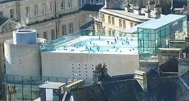 浴场的主楼称为新皇家浴场(New Royal Bath),由尼古拉斯·格里姆肖爵士的格里姆肖建筑事务所设计,是一座21世纪的“玻璃立方”新建筑,用巴斯岩建造,外面由玻璃包围。这座建筑的风格非常现代,靠近古老的皇家浴场遗址,与周围历史悠久的乔治时代建筑形成鲜明对比。浴场内包括两个天然温泉浴池,底楼的密涅尔瓦室内浴场(Minerva Bath),二楼的大型健康套房(Wellness Suite),两个芳香蒸汽室(罗马蒸汽室和乔治蒸汽室)、一个冰室、红外线桑拿房和一个天际放松室(Celestial Relaxation Room),以及热门的露天屋顶浴池(2017年開放),从那里可以俯瞰巴斯市区的壮观美景。[6][7] 还设有咖啡厅、三个休闲区和27间水疗护理室,提供按摩服务。[8]。