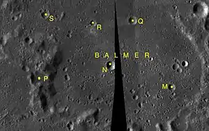 按惯例,最靠近巴耳末环形山的卫星坑在月图上以字母标注在该坑中心点的旁边。