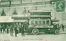 1906年6月11日, 巴黎开通了首条采用汽车的公交线路, 连接蒙马特和拉丁区一带, 汽车型号为Schneider Brillié P2型, 高4.25米, 长6.24米, 可以容纳32人, 车身呈乳黄色, 共有两层, 上层还有一层顶棚覆盖. 不过自1910年开始, P2的后续型号P3型去掉了顶层, 回归传统的单层公交, 1912年P3型全面取代了P2型. 在那几年当中, 巴黎又开通了多条采用汽车的公交线路, 1913年1月11日, 马车走进了历史.