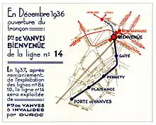 - 城铁公司并购北南公司后,于1933年起接手修建北南公司1901年三条地铁线计划中遗留下来的C线 (蒙帕纳斯车站-旺沃门站,往巴黎南部),但由于时间紧迫,仅修建了比安弗尼站 (现为蒙帕纳斯-比安弗尼站) 以南的路段。1937年1月21日,C线完工并成为14号线。同年,为使左岸的地铁路网更加均衡,巴黎地铁线路在巴黎左岸西部进行了一个很大的调整: 8号线改为开往巴黎西南角,10号线相应的延伸至8号线原有的西部路段,而弃用自身固有的西北路段,即荣军院路段。而14号线新修了一段隧道接通比安弗尼和迪罗克站,接上10号线的弃用路段。此时14号线连接旺沃门站和荣军院站。