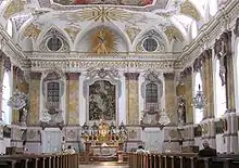教堂内部分为上下教堂。上教堂(Oberkirche)相当于市民会馆。只有天花板壁画“圣母升天”(Martin Knoller, 1773/74)没有修复。总体设计为Johann Andreas Wolff。由于最初并非用于宗教仪式,主祭台位于北部。下教堂(Unterkirche)包括三间没有窗户的房间,19世纪末始建。