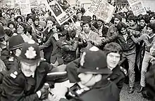 警方正式报告声称,下午五点半到六点半,高街警戒线示威人群开始投掷物品,暴力行径升级,下午六点二十分左右,约五百至两千名示威者企图突破警戒线,警方于是出动骑警驱散人群[42][43]。当天就在现场的作家雅斯明·阿利拜-布朗认为,警方战术从遏制改为驱散导致局面转变,人群因此向警察投掷物品[44]。
