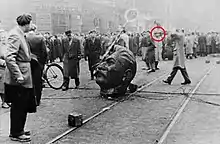 布达佩斯的警方负责人Sandor Kopacsi叙述道:“示威者……在25米高的斯大林雕像脖子处绕上了粗钢丝绳,其他人乘卡车到达,用氧气瓶和金属割炬对付雕像的青铜靴。……一小时后,雕像倒下。”
