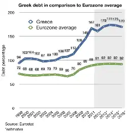 自2009年末開始,因為希臘國債水平增長強勁,投資者紛紛關注希臘償還債務的能力,主權債務危機的恐懼正逐漸醞釀。[1][2][3]由債券息差擴大和信貸違約掉期的風險保險成本(對比其他歐元區國家,尤其是德國)表明,這導致信心危機。[4][5]全球三大信用评级机构下调希腊主权信用评级。[6]