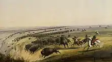 野牛是平原游牧部落的主要食物来源,其他猎物还包括马鹿和叉角羚。在马匹传入以前,狩猎的流程比较复杂,猎手会事先包围牛群,然后将之引入特定地点将之猎杀。还有猎手会披上野牛皮模仿叫声以诱骗野牛。在火器传入以前,当地部落以长矛、弓箭和棍棒作为武器。马匹令狩猎工作变得相当简单,骑马的猎手可以轻易追赶野牛。平原印第安人还会削短其使用的弓,以利骑射。火器传入后,平原印第安人并未弃用弓箭,因为枪支的装填速度慢,且较沉重。主要的狩猎季节是秋季、夏季和春季,冬季严寒的风雪令狩猎活动变得困难。19世纪,对于北方游牧民来说,一年四季大概包括如下活动:以拉科塔人为例,当寒冬结束、天气转暖时,马群逐渐恢复元气,游牧民将在春季展开集体的野牛狩猎;到秋季,各支族再度散居各地进行狩猎,为冬季储存肉食;秋季狩猎结束、冬季到来前,拉科塔战士将发动战争和突袭行动;冬天到来以后,拉科塔人入住冬季营帐,进行宗教仪式,并着重打理马群,确保它们有足够的饲料撑过冬季[17]。