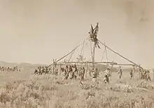 北美野牛在屠杀行动下几近灭绝,到20世纪初仅余下数百头。到19世纪80年代,北美原住民几乎失去和美国政府抵抗的能力,被逐入保留地内,野牛屠杀和瘟疫疾病亦令北美原住民的人口骤减[23][24]。在此背景下,部分平原部落兴起新宗教运动,以此祈求白人殖民者消失、野牛群重现。鬼舞是代表性的新兴仪式,由大盆地地区的原住民北派尤特人的精神领袖沃沃卡发明,他声称鬼舞仪式可以白人消失、野牛回归,令人不怕枪弹,生者和死者的魂魄在理想的世界中联合[25]。19世纪末,又诞生了美国原住民教会[26][27][28]。鬼舞仪式成为新一阶段冲突的导火索,1890年12月29日,美军在伤膝河杀害了至多三百名印第安人,大部分是老人、妇女和儿童,称为伤膝河大屠杀[25]。伤膝河大屠杀是北美印第安战争最后一次大规模的冲突[2]。