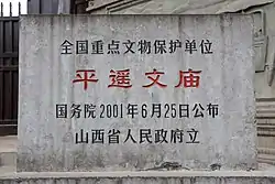 1997年平遥文庙连同平遥古城,平遥双林寺等被列入世界文化遗产。平遥文庙现为全国重点文物保护单位,中国国家4A级旅游景区。