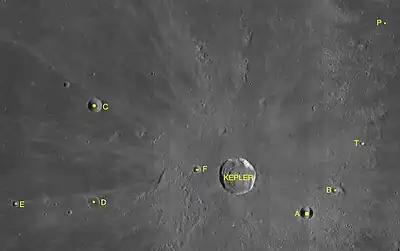 按惯例,最靠近开普勒陨石坑的卫星坑将在月图上以字母标注在它的中心点旁边.
