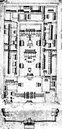 山门内有石桥三座,桥下是方形水池,池中水来自寺东的北海。池北为天王殿,殿前东西分别有钟楼、鼓楼。[1]