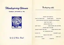 平民保育團(Civilian Conservation Corps)在1935年的感恩節大餐包括:醃黃瓜、綠橄欖、芹菜、烤火雞、燉牡蠣、蔓越莓醬、雜碎肉汁、填料(dressing)、奶油蘆筍尖、馬鈴薯、烤胡蘿蔔、熱麵包、水果沙拉、絞肉餡餅、水果蛋糕糖果、葡萄、蘋果、蛤蠣、魚和許多其它作物。法式滴濾咖啡雪茄和香菸。[4]