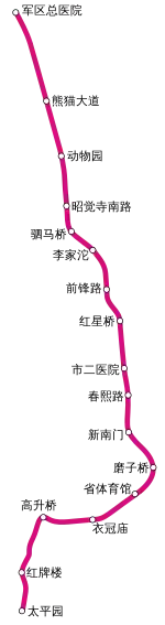 线路出红牌楼南站后沿佳灵路由西南向东北方向敷设,敷设至佳灵路与二环路交叉口东北面设红牌楼站,出站后沿高升桥路继续向东北面敷设至一环路附近,拐向东面一环设高升桥站,出站后沿一环路向东敷设,在洗面桥街与一环路交叉路口设衣冠庙站,并沿一环路向东敷设至人民南路与一环路交叉路口设省体育馆站与成都地铁1号线换乘,出站后沿一环路继续向东敷设一段拐向北面新南路与林荫中路交叉口处设磨子桥站,出站线路沿新南路向北敷设在与致民路交叉口处设新南门站,出站线路沿红星路北行穿过复兴桥过南河、滨江路及东大街,在联升巷与红星路交叉口处设2、3号线春熙路换乘站,出站继续沿红星路北行,穿过CBD地区,在红星路与武城大道交叉口处设3、4号线市二医院换乘站,出站继续沿红星路北行穿过一号桥过府河,在一号桥北端设红星桥站,出站后拐向马鞍北路,在马鞍北路与一环路交叉口处设3、6号线前锋路换乘站,出站沿前锋路向北敷设一段,拐向二环路在三友路与二环路交叉口处西侧设李家沱站,出站后线路拐向川陕路在驷马桥路设驷马桥站,出站后沿川陕路北行,在公交总站北面附近设动物园站,出站后沿川陕路北行,穿过三环在熊猫大道与川陕路交叉口南面设熊猫大道站,出站沿川陕路北行,穿过东风渠,在成都军区总医院对面路中设一期工程终点站军区总医院站。
