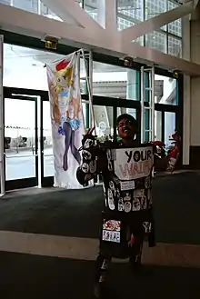 Anime Expo 2016的Cosplayer为“我老婆”(waifu)《伪恋》桐崎千棘打扮成垃圾桶