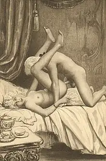 - 令女仰臥,以兩手自舉其腳,男跪女後,以兩手據床……」