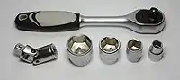 ![]() | 套筒扳手 | 此類扳手末端為中空的套筒,可以套住螺栓或螺帽的一端。套筒有時附有把手,和萬向接頭及插座配合其他工具使用。优点是夹座内置棘輪這種单向机构,可直接来回摆动而不必放开,故有“喀哩喀哩”的绰号。 | 插座 |