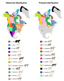 | 北美灰狼亞種的歷史和現在的分佈範圍 | |