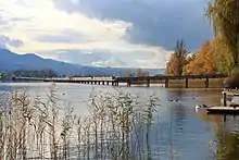 拉珀斯维尔-胡尔登木桥横跨苏黎世湖。图中前景为胡尔登,湖对岸为拉珀斯维尔