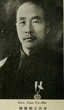 韩复榘,河北霸县人,幼年曾读过私塾,且颇具才艺,不仅会吟诗弄文还爱好多种体育运动,如:骑马、游泳、足球和篮球等。后弃文从武在冯玉祥部任职,韩早年作战勇敢颇受冯玉祥赏识,至北伐战争时期,韩就任2第集团军第6军军长兼第3方面军总指挥。之后,由于性格不合等种种原因,韩、冯之间的矛盾逐渐显露,而北伐之后,国军即爆发内战,在中原大战期间,蒋中正对韩复榘赠予重金并许以高官,韩即倒戈相向投靠了蒋中正,并任职山东省主席7年。期间,对山东教育发展十分努力,然而韩大力扩充军队,不仅将原有的三个师扩充为五个师又一个旅,还编练了4路“民团”共计约6万人并自任总指挥,将山东发展成为自己的小王国,此举引起蒋中正的不满。1936年西安事变中,韩复榘通电全国号召各省自治,蒋韩矛盾愈发激化。中日战争全面爆发后,韩复榘力图保全自己的山东地盘,并和日本人秘密和谈,日本方面也推迟了向山东黄河以南地区进攻的时间,但终因双方要求相距甚远而未能达成共识。[2][3]