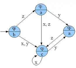 有x, y, z作为输入和a, b, c作为输出的摩尔机状态图