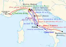 與此同時,羅馬城內團結成立了強大的反安東尼聯盟來支援布魯圖·阿爾比努斯,特別是西塞羅在前44年底回歸元老院時更達高潮。西塞羅發表了一系列越來越堅定反安東尼的演講,稱腓力修辭。前43年1月1日,奧盧斯·希爾提烏斯和蓋烏斯·維比烏斯·潘撒兩位凱撒溫和派成員成為執政官,於是共和派先發制人,宣布安東尼為羅馬公敵,合法化布魯圖·阿爾比努和屋大維的軍事行動,同時招募新的軍團。[7]