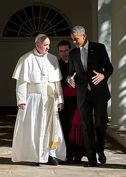 ![]() 訪美的教宗方濟各與美國總統贝拉克·奧巴马,攝於白宮東翼 | |