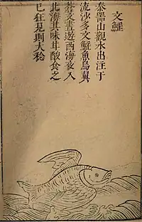《山海经·西次三经》泰器之山,观水出焉,西流注于流沙。是多文鳐鱼,状如鲤鱼,鱼身而鸟翼,苍文而白首赤喙,长行西海,游于东海,以夜飞。其音如鸾鸡,其味酸甘,食之已狂,见则天下大穰。