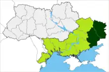 深綠色突出的部分是新俄羅斯邦聯(2014年)宣稱的領土,淺綠色部分是聲稱曾經是新俄羅斯的歷史領土。