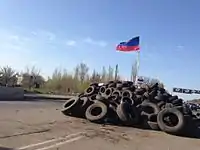 ![]() 顿巴斯战争及后续的俄乌战争现况,红色地区为俄军和亲俄武装控制的地区;黄色及蓝色地区为乌政府军控制的地区;橙色地区为双方当前交战及对峙的地区。 | |
