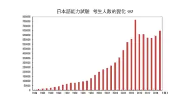 從1984年到2008年,每年的日語測試考生人數都在增加,2009年增長到高峰,次年至今開始幾乎持平。