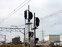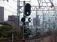 日本的铁路系统中,有显示前方1个闭塞区间状况的“二位式”和显示前方2个以上闭塞区间状况的“三位式”两种显示方式。采用二位式中“绿色”与“红色”两色为基本显示,三位式中则“绿色”、“橙黄色”与“红色”三色为基本显示的色灯信号机。这种信号与公路信号十分相似,但与公路信号最大的差异在于铁路信号采用相反的亮灯顺序(绿→红→黄→绿)以及用亮不同颜色组合的灯(信号显示)来体现前方闭塞区间与速度限制。
