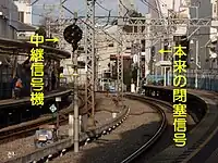 - 在地下铁等设置圆形的中继信号机较困难的场合,会设置带有中继信号机标识(始终亮着的一盏紫灯)的普通色灯信号机,其显示与主体信号机相同(重复显示)。