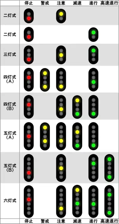 四灯式、五灯式的A、B型是为了方便区分而加上的,有时A、四灯式B和五灯式B也分别被称作“警戒(显示)型”、“减速(显示)型”和“高速行进(显示)型”。