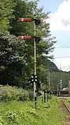 存在高速行进的北越急行北北线、京成成田机场线使用竖排两个信号机,当显示高速时两个都显示竖线,行进及以下信号时上面的信号机不亮灯,只有下面的显示。