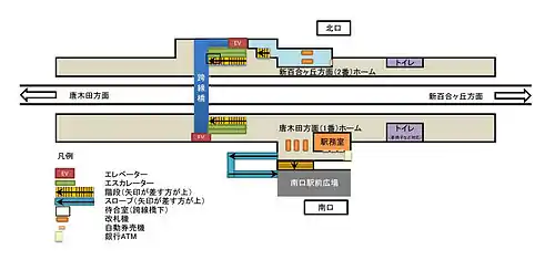 本站是當時2004年日本國內新站中少見的地面車站[2][5],可停靠10輛編組列車的2面2線側式月台構造。兩月台間的天橋在考慮通風、採光的因素下增加大型屋頂[5][27]。剪票口分為北口與南口兩處,北口在新百合丘方向月台(以下稱上行月台),南口在唐木田方面向月台(以下稱下行月台)[2]。站務室位於南口,站員也僅配置於南口[2][12]。值勤職間為7:30~11:00與13:00~末班車,其他時間無人執勤[2][註釋 5]。本站設置由10座額定輸出功率400kW的風力發電機與8座額定輸出功率136kW的太陽能電池組成的混合型發電系統,為車站設備電力來源之一[4][28],而上行月台屋頂作有部分綠化工程[3][5]。兩月台之間的天橋設有電扶梯與電梯,上行月台電梯可通至北口[2]。下行月台有無障礙廁所,上行月台為一般廁所[29][2]。上行月台的候車室配備空調[3]。2010年度於站內設置列車資訊顯示器[30]。本站在2005年入選鐵道建築協會獎[6]。