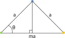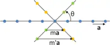 考虑共线的一行原子A-O-B,相互间隔为a。将整行原子(蓝色)关于点O 旋转θ = +2π/n 得到黄色原子链;旋转θ = −2π/n 得到绿色原子链,如图所示。由于晶格周期性(平移对称性)的假设,同一行的黄色原子与绿色原子的间距必须为r = ma,其中m为整数。而通过几何推导,我们知道这些点之间的间距为: