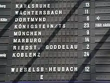 - 伦敦利物浦街车站,显示板于2007年9月退出服务; 曾有一部摄像头用于播送频繁更新的显示板图像,但在2007年被换成一则中断告示;[8]显示板,如图所示是蓝色的,每格显示一个目的地,运营商显示在中途停站上方,并能显示一系列的特殊信息,包括“渡轮接驳”、“特别班次”、“国际列车”、“斯坦斯特德特快”和“本列车已由道路替代运输服务接替”;