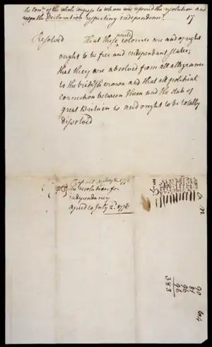 - Text of Lee's Resolution (页面存档备份,存于) from the Avalon Project at Yale Law School