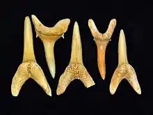 | 发现于摩洛哥胡里卜盖的怀特条纹鼠鲨的牙齿化石 | |