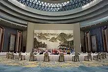 博览中心是2016年G20杭州峰会的主场馆。[4][5]迎宾区位于二层,会议区位于四层。[1]