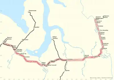 这条铁路起自鄂毕河岸的萨列哈爾德,终到叶尼塞河岸的伊加尔卡,全長1297公里[2]。东段由503劳改营负责从伊加尔卡开始,沿叶尼塞河南下在叶尔马科沃跨过叶尼塞河,经亚诺夫斯坦至乌连戈伊。501劳改营负责从萨列哈爾德向东修建。全线28个车站,106个会让站。当时不具备修建2.3km长鄂毕河大桥与1.6km长叶尼塞河大桥的技术能力,夏季使用轮渡,冬季则为跨河冰上铁路。线路以原木结构为路基,上铺20厘米厚道渣碎石。为避开遍布的沼泽,线路相当曲折。1952年8月,萨列哈爾德-纳德姆铁路客运开通。