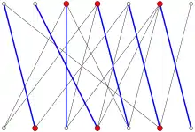 例如,在图中的二部图中,最大匹配(蓝边)和最小顶点覆盖(红点)数均为 6。