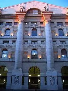 米兰证券交易所成立于1808年,位于该市的蒙特迪皮耶塔(Monte di Pietà)。次年,它被移到商人广场朱利康素蒂宫;20世纪初,再次搬迁至科尔杜西奥广场的新建大楼;这座大楼现为意大利邮政的总部,并因此更名邮政宫(Palazzo della Posta)。