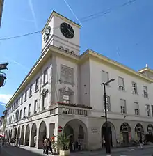 建筑师是埃托雷·索特萨森,外部浮雕和绘画是雕塑家阿尔伯特·斯托尔茨(1875-1947 年)的作品。钟楼,上面刻着 "CIVIVM HONORI REI PUBLICAE LABORI VRBIS DECORI MCMXXIX ANNO VII" (献给公民 - 献给国家 - 献给城市作为装饰 - 法西斯第7年(1929年))。