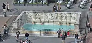 喷泉周围为长方形,锡耶纳市政厅一侧敞开,另外三面为斜坡,因此必须加上围栏。