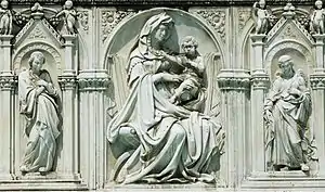 喷泉装饰是关于道德和宗教的传统主题,不过其形式特征非常自由活泼。喷泉的两个短边描绘浮雕《创造亚当》(Creazione di Adamo)和《驱逐》(Cacciata dei progenitori),前柱描绘雷亚·西尔维亚和阿卡·拉伦蒂亚,长边中间描绘圣母子,两边是美德(Virtù)和天使(Angeli)。