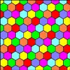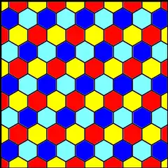 正六边形镶嵌共有3种不同的半正涂色,都可以由Wythoff镜面对称构造出来。(h,k)表示一种涂色的面周期性重复,以正六边形距离h、k计数,h在先,k在后。