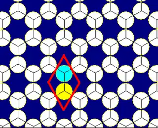 正六边形镶嵌可以被用来进行圆堆砌,以其每个顶点为圆心放置等直径的圆。在这个堆砌里,每个圆都与3个相邻圆接触(接触数)。每个正六边形中间的部分实际上还可以再放入一个圆,这样我们就会得到二维最密圆堆砌——正三角形镶嵌式圆堆砌,这时接触数达到最大值6。