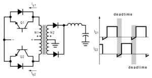 推挽式連接的兩個電晶體開關,交互地導通和關閉來改變線圈中電流的方向。為避免兩個電晶體同時導通造成不要的電流浪湧,控制電路在開關動作引入了deadtime特性。在deadtime期間,即使前置系統發出要另一顆電晶體導通的信號,控制電路仍保持關閉的驅動狀態。